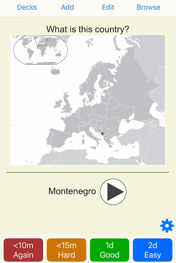 This one here presents a map with all countries greyed out aside for one. You take a guess (mentally) and then reveal the answer. You then select whether you didn’t get (“Again”), found it difficult but answered correctly (“Hard”), got it (“Good”), or found it second nature (“Easy”).